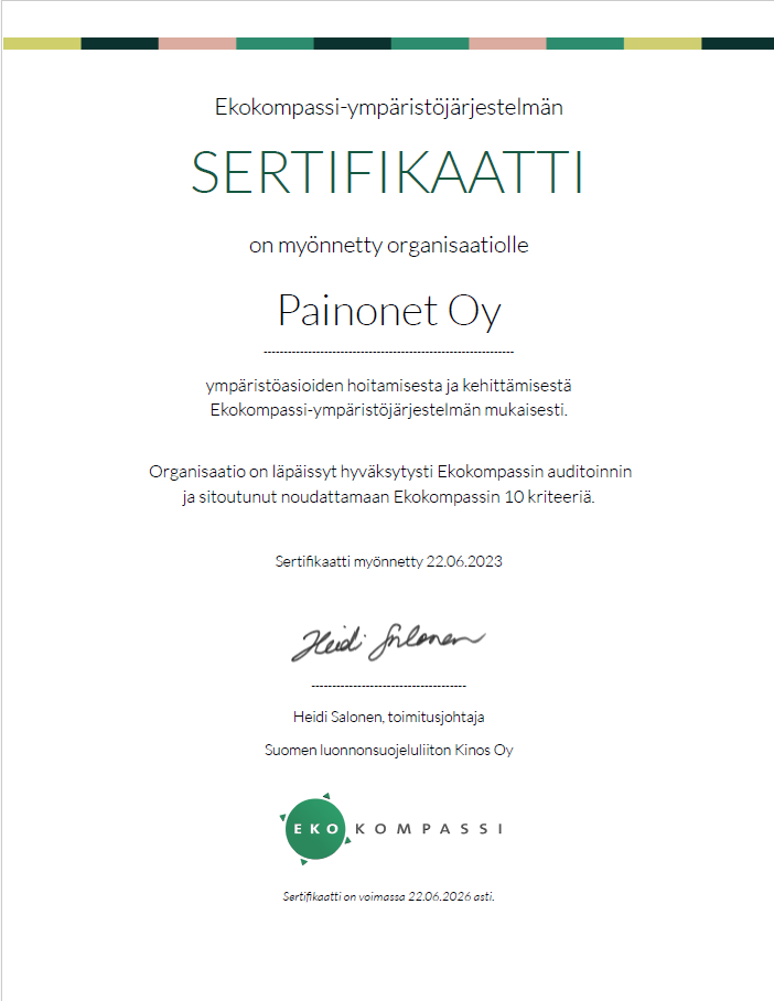 Todisteena vahvasta ympäristöä huomioivasta toiminnastamme, meille on myönnetty Ekokompassi-sertifikaatti. Sertifikaatti on uusittu kesällä 2023 seuraavaksi kolmeksi vuodeksi.